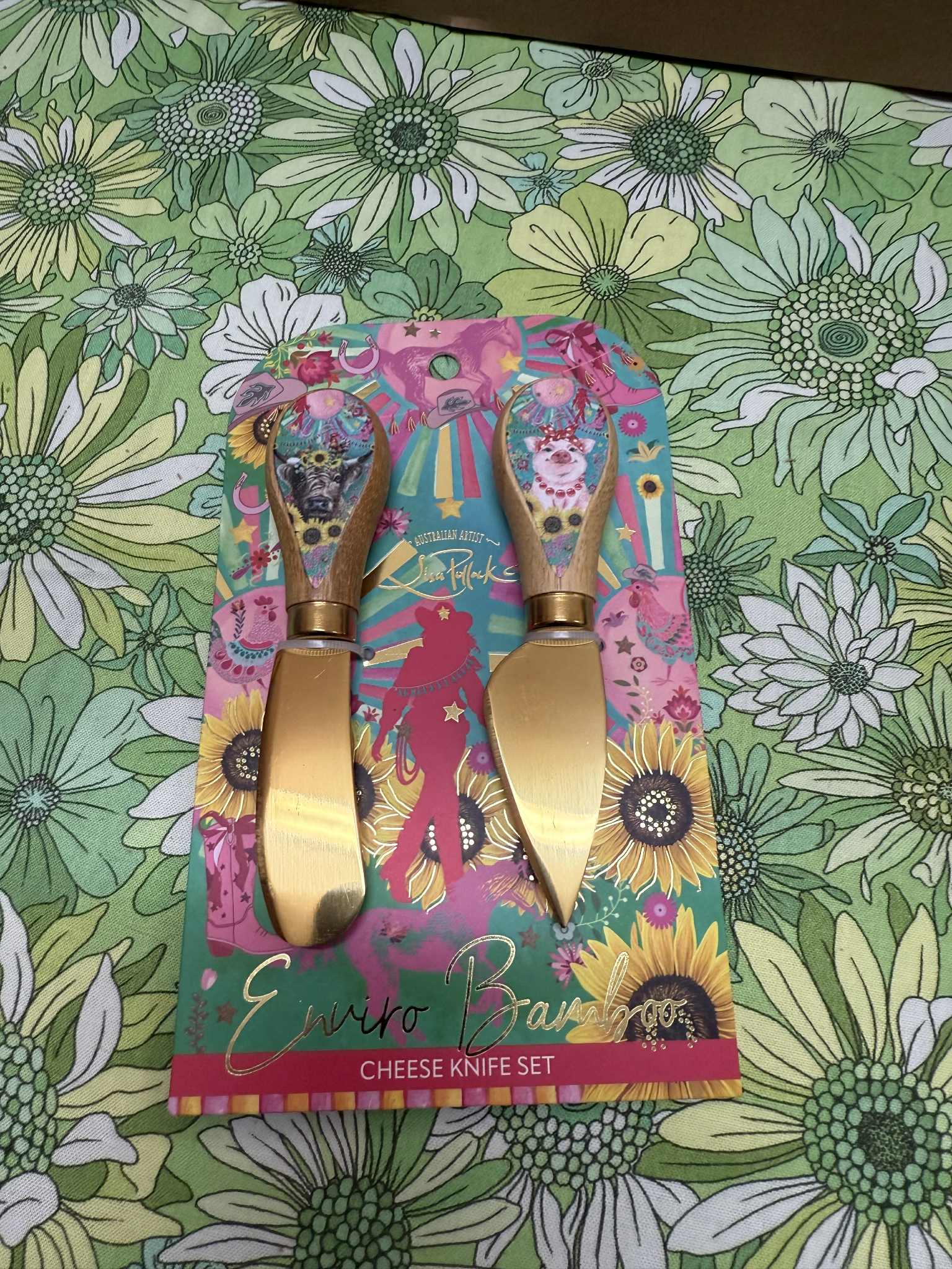 Calling all cheese enthusiasts! Every proper cheese board deserves quality knives, and this delightful duo delivers. Featuring stainless steel blades paired with eco-conscious bamboo handles adorned with one of Lisa Pollock's whimsical design, these knives are as charming as they are functional. Simply hand wash or give them a quick wipe with a damp cloth to keep them looking fabulous. Perfect for slicing, spreading, and serving your favourite fromage in style.