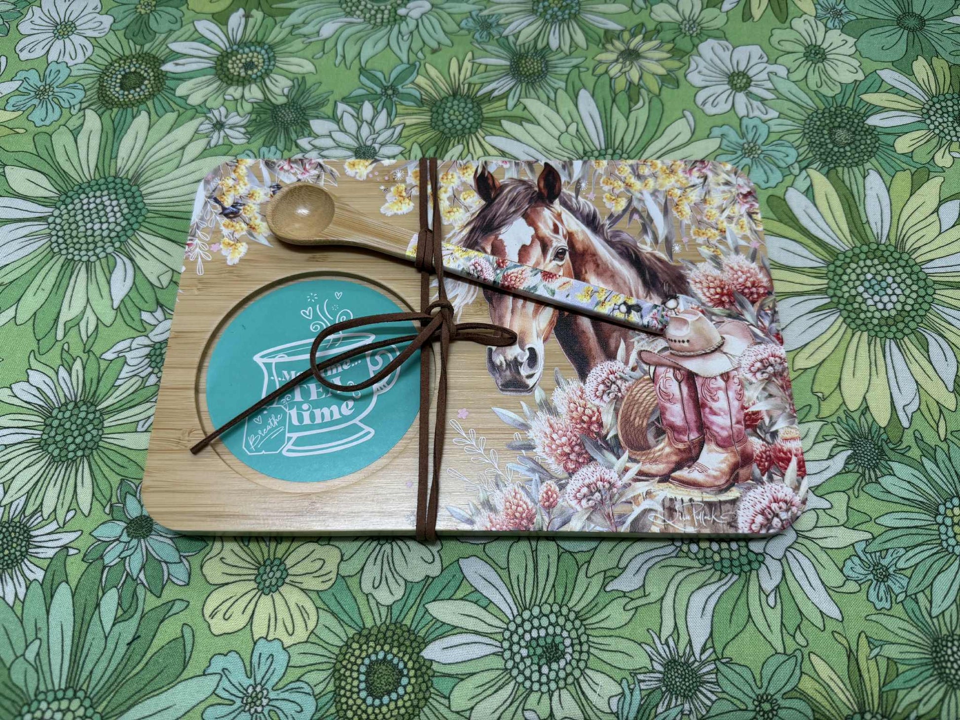 Brighten your tea break with this delightful bamboo tray showcasing one of Lisa Pollock's whimsical designs. At 21x14cm, it's just the right size for arranging your favourite tea, coffee, and treats. Complete with a coordinating spoon, it's ready to add a splash of cheerful colour to your kitchen moments.